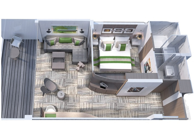 | CS - Celebrity Suite 37 m² + balkón 9 m². 11,12. paluba vpredu. Max 4 osoby. Výhody Suite. | 16 131 € 5 377 € za osobu |