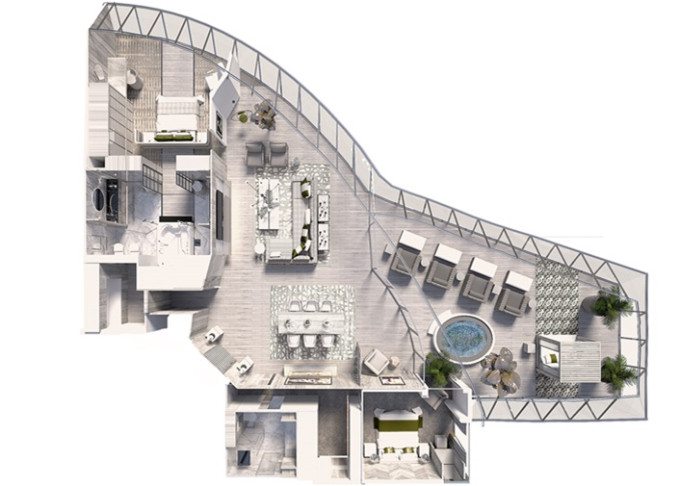 | IC - Iconic Suite s balkónom 176 m² + terasa s vírivkou 64 m². 2 spálne, 2 kúpeľne (1 s vírivkou).12. paluba vpredu. Max 6 osôb. Výhody Suite. | 34 284 € 17 142 € za osobu |
