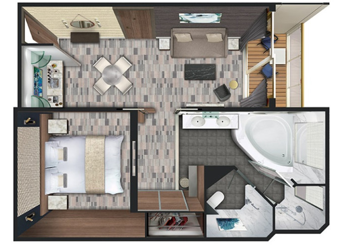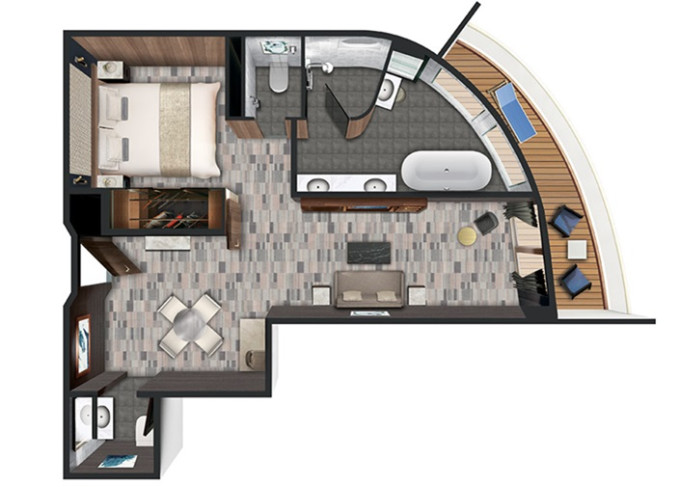 | SB - Aft-facing Owners Suite 56 m² / balkón 6 m². Vírivka. 9. paluba - vzadu. Max 2 osoby. Výhody Suite. | 36 968 € 18 484 € za osobu |
