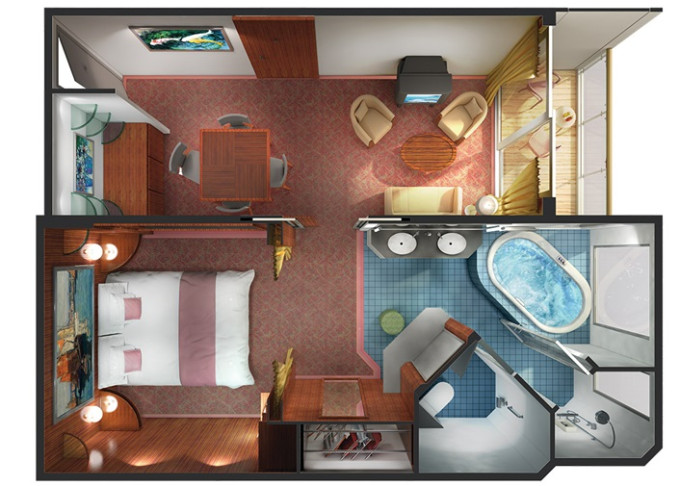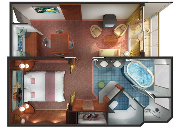 | SC - Forward-facing Deluxe Penthouse Suite 51 m² / balkón 10 m². Vírivka. 10. paluba - vpredu. Max 3 osoby. Výhody Suite. | 33 290 € 16 645 € za osobu |