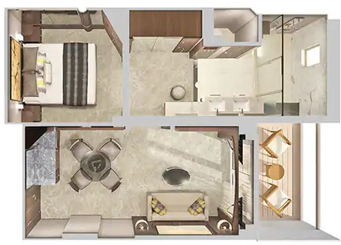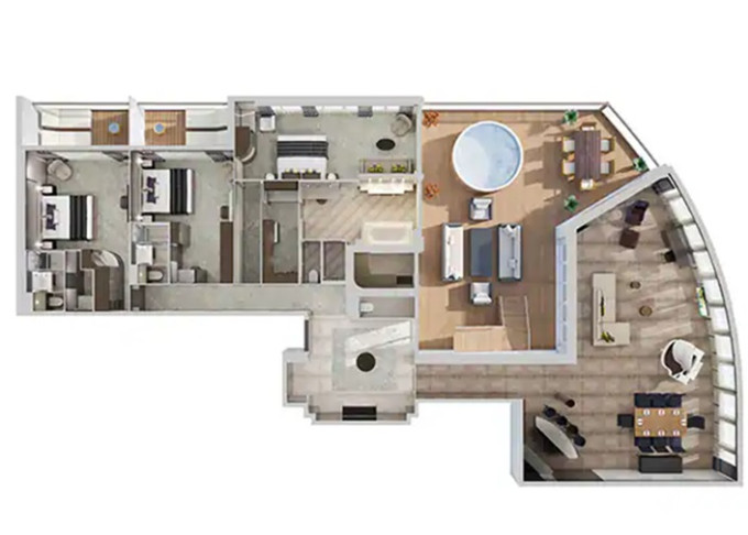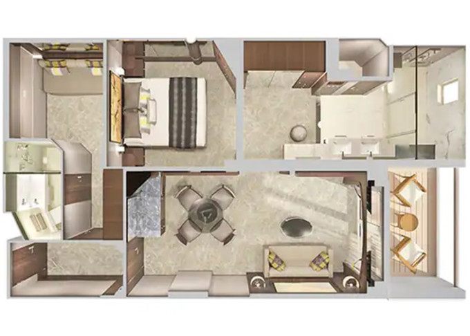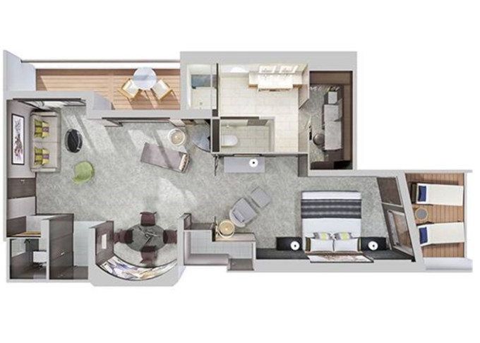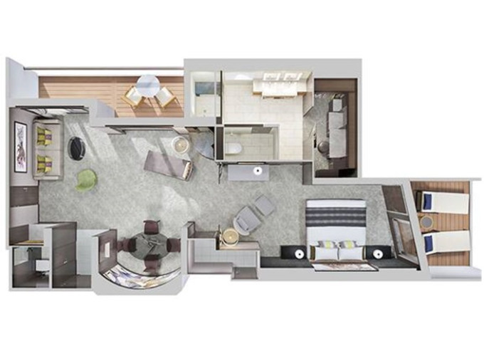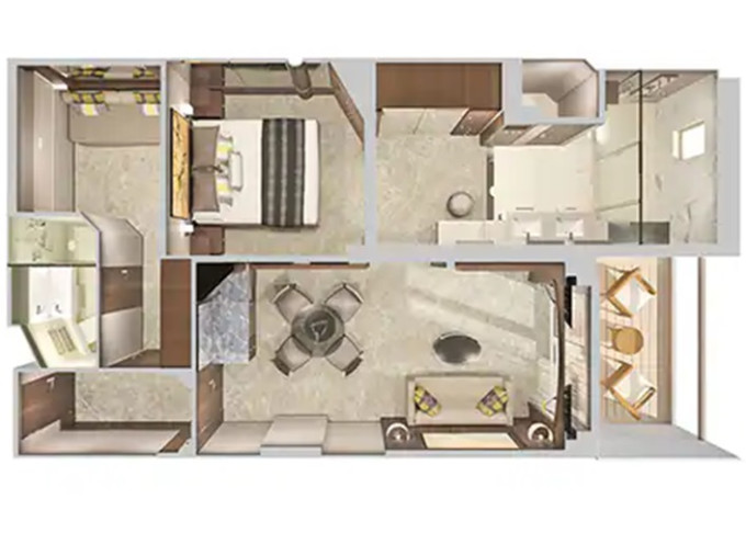 | S4 - Deluxe Family Suite - 2 spálne 50 m² / balkón 5 m². 11. paluba - vpredu, stred. Max 6 osôb. Výhody Club. | 12 198 € 6 099 € za osobu |