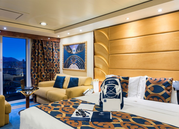 Suite s balkónom/panoramatickým oknom: cca32m²(Royal suite: 52m², Family suite: 45-53m², Deluxe Suite: 32-39m², Aurea suite: 21-47m²), kajuta s manželskou posteľou (na požiadanie 2 oddelené postele) a rozkladacia pohovka. Klimatizácia, kúpeľňa s vaňou, toaletný stolík, priestorná skriňa, interaktívna TV, telefón, minibar, sejf, sušič na vlasy. Balkón so stolíkom a stoličkami/panoramatickým oknom. Internetové pripojenie (za poplatok).